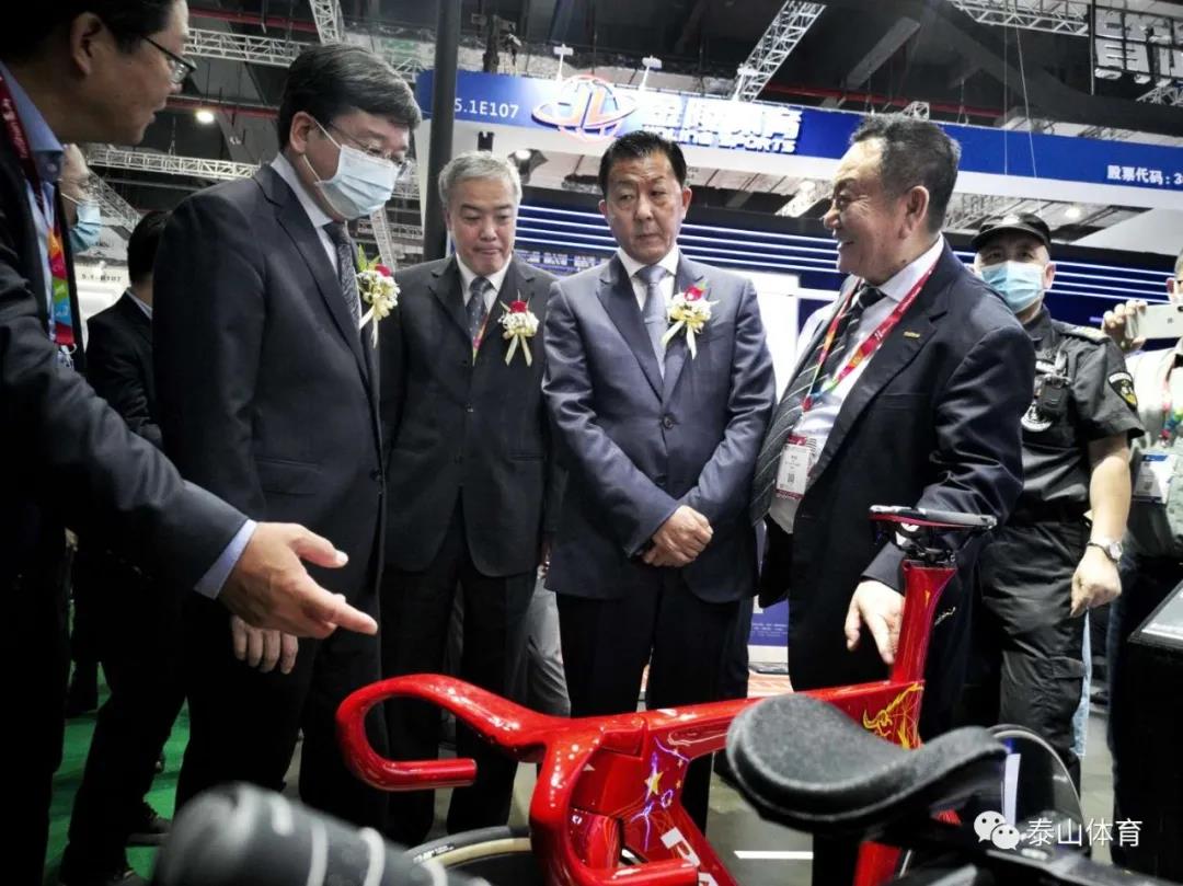 国家体育总局基金会理事长吴齐、山东德州市政协主席翟长生、德州市副市长马俊昀、德州市工信局局长孙洪昌、德州市科技局局长张慧君、乐陵市市长陈光春、乐陵市政协主席刘文学、乐陵市副市长牟正军在pg麻将胡了2电子体育展厅参观。